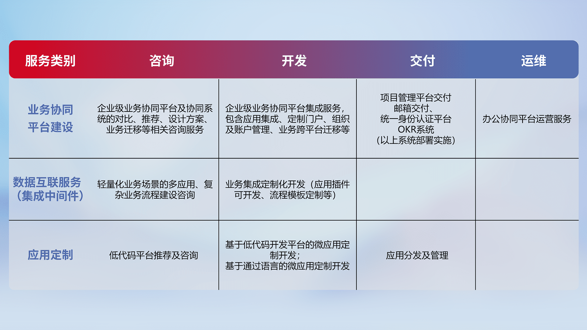 针对钉钉、、、企微、、IDaas等平台级产品提供产品的规划、、、、方案、、交付、、、定制化开发等服务,,,,实现如统一协同办公、、、、智能客户服务、、、混合会议管理、、、、智能数据查询、、等业务场景,,,实现数字化转型。。