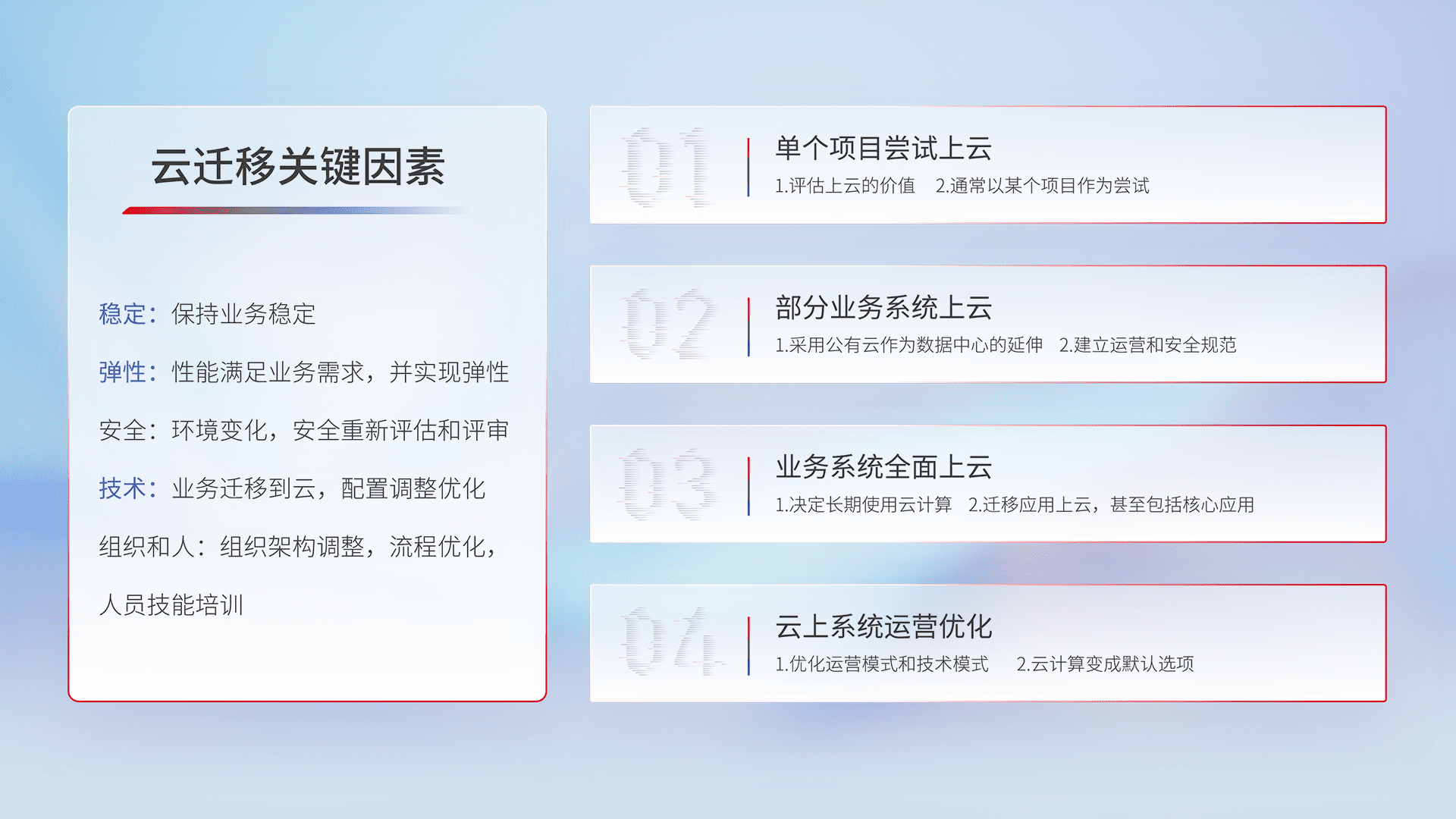 结合实际业务,,从规划设计、、云平台选型、、云原生改造、、数据迁移、、、集成交付,,迁移全过程为客户识别最佳上云路径,,,做好风险识别管理,,设计网络架构、、、身份权限、、安全审计合规、、、、操作审计、、、、日志审计、、、监控告警策略、、多站点容灾设计等,,,对云上基础设施进行整体规划,,提升IT治理水平,,以满足弹性、、高可用、、、高性能的需求。。