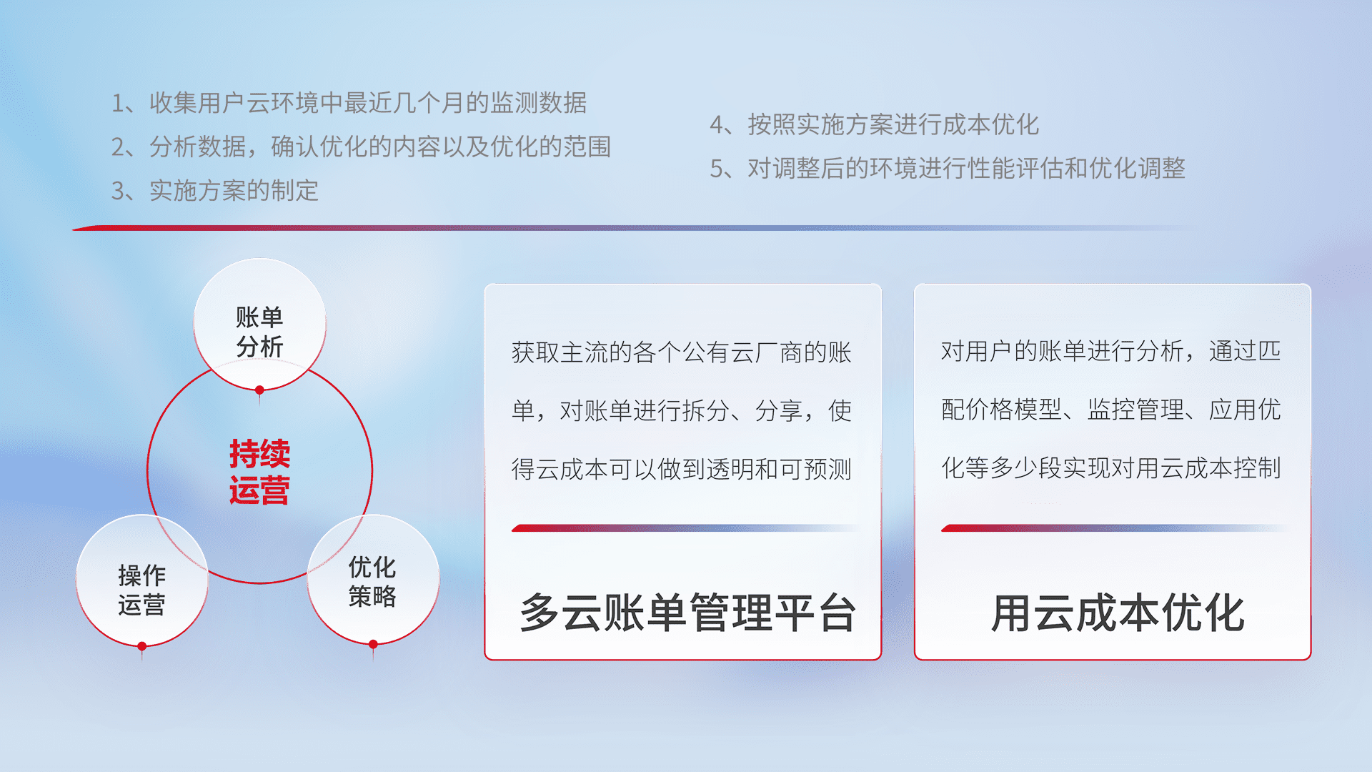 通过多云纳管,,以统一的资源数据模型把客户的云资源进行抽象和封装,,,,进而实现对多云资源的统一操作,,,,保障云资源管理的可靠性、、稳定性与可用性。。。量身定制化运维内容,,,,配置、、、、开发运维、、、、补丁管理、、、备份、、、、监控、、、认证和访问管理、、审计和日常巡检等,,,,保障在用云过程中的可靠度,,稳定度以及高可用率。。。
